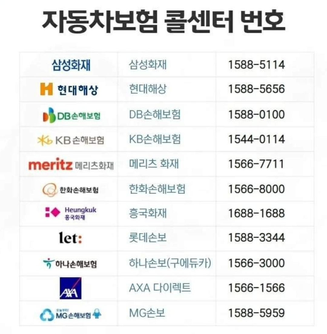 자동차보험 콜센터 전화 번호 삼성 화재, 현대해상, 동부손해보험, 국민손해보험, 메리츠 화재, 한화 손해보험, 흥국화재, 롯데 손보, 하나 손해보험, 악사 다잉렉트, 엠지손보, axa 콜센터 번호를 확인하세요.