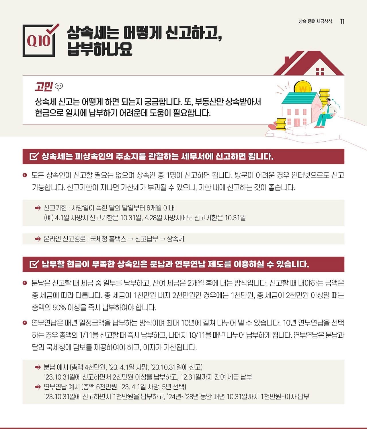 당황스러운 상속세 고민을 국세청이 풀어드립니다. 상속세 신고 납부 방법과 상속 주택 가격을 어떻게 정하는지, 2주택자가 된 경우, 어떤 주택을 양도하는게 좋은지, 모르고 넘어가서 손해보는 일이 없도록 알아보겠습니다.