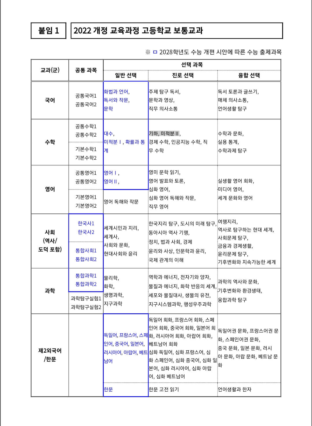 - 2028 수능은 국수탐 선택과목 없이 통합평가(하단 표 참조)