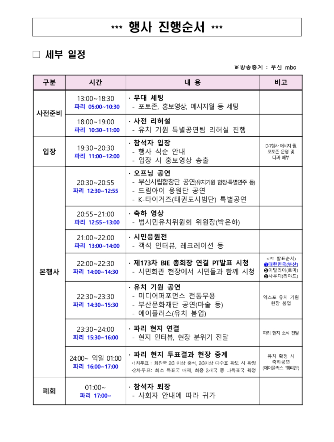 현지 생방송 뿐만이 아닙니다. 부산에서도 다양한 유치기원공연은 물론, 프랑스 현지와 연결하는 생중계와 시민 인터뷰가 진행됩니다. 부산 시민 행사는 바다티브이에서 라이브로 중계됩니다. 위 해당 페이지에서 그 생생한 현장을 느껴보세요.