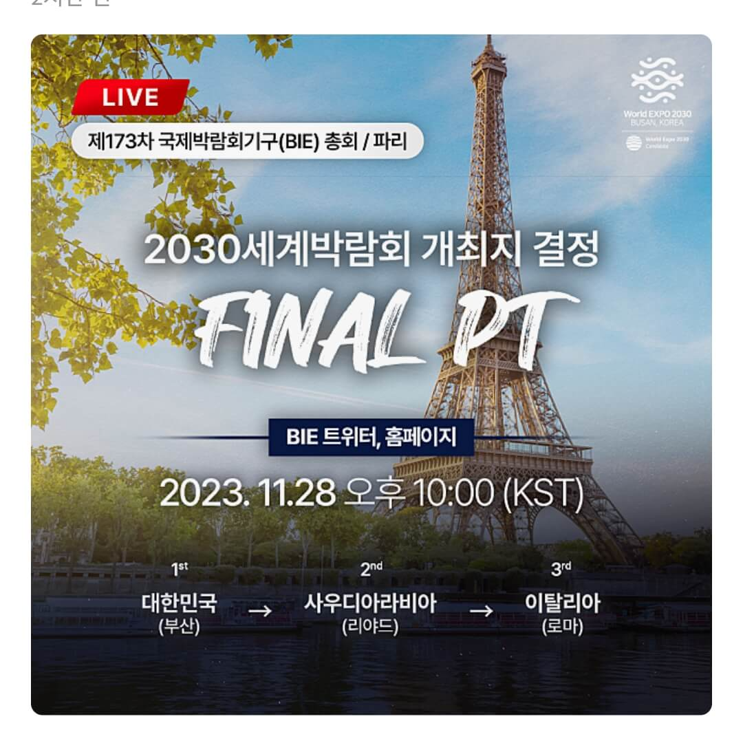 총 182개 회원국의 비밀투표가 진행되어 1차 투표에서 2/3를 득표한 국가, 만약 그런 국가가 없다면 2차 투표에서 많은 표를 국가가 개최국으로 선정되는 방식인데, 1차에서 사우디가 엄청난 표를 획득하고 2030 세계박람회를 개최하게 되었습니다.