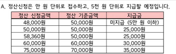| 정산신청금약 | 정산기준금액 | 지급액 |